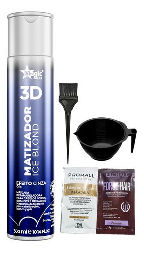 Matizador 3D Ice Blond - Efeito Cinza As Máscaras Matizadoras 3D contêm exclusiva tecnologia Amino-Pro Color, um complexo de aminoácidos e proteínas com sistema TRIPLA AÇÃO: matiza, restaura e protege. Com pigmentos de alta performance, neutralizam o amarelado e alaranjado dos fios, esfriando os tons quentes que são causados pela ação do tempo, processos químicos e ferramentas de calor que causam a oxidação da cor. Amino-Pro Color: repõe aminoácidos e proteínas reforçando sua estrutura, repara o fio danificado e quebradiço, atua como protetor térmico e filtro UV vegetal*. ATENÇÃO: O resultado da neutralização varia de acordo com o clareamento do fio, preparo do produto e tempo de pausa. REALIZE TESTE DE MECHA antes da aplicação. Este produto não tem função de clarear os fios. Modo de uso: Após lavar os cabelos com shampoo, dilua o matizador em máscara branca. Sugestão: 1 medida de matizador para 2 de máscara branca. Aplique mecha a mecha entre 3 e 10 min., conforme o tom desejado. Enxágue. Para fios mais claros e muito danificados, aumentar a diluição do produto.